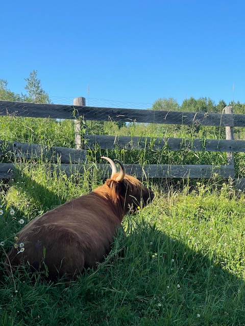 Sadie is a Scottish Highland cow who is all heart. Her favorite things are fall asleep while getting brushed and taking nice naps in the shade.